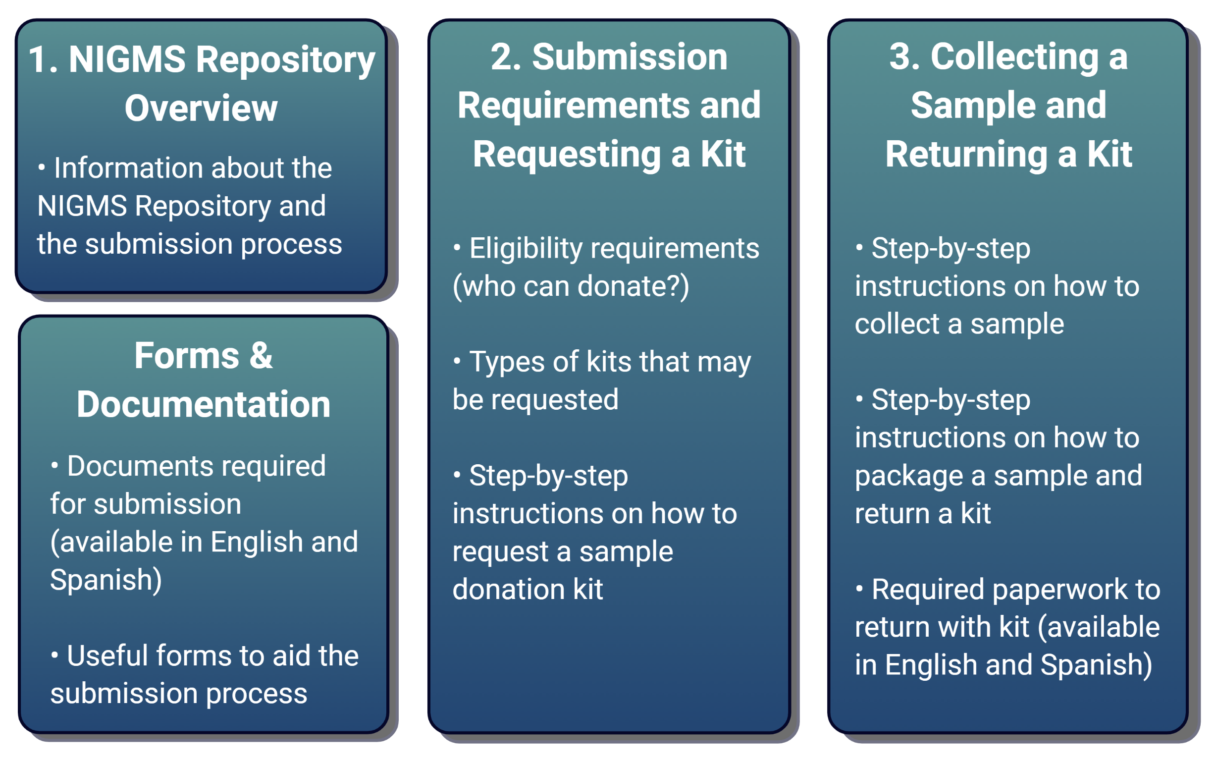 Click on each of the process steps below to learn more about submitting to the NIGMS Repository.