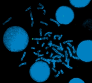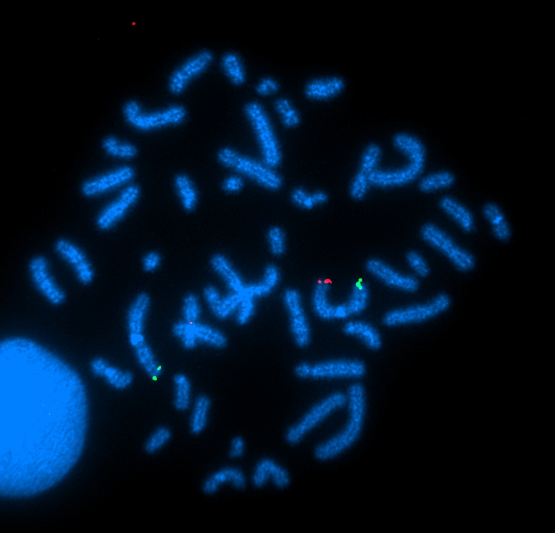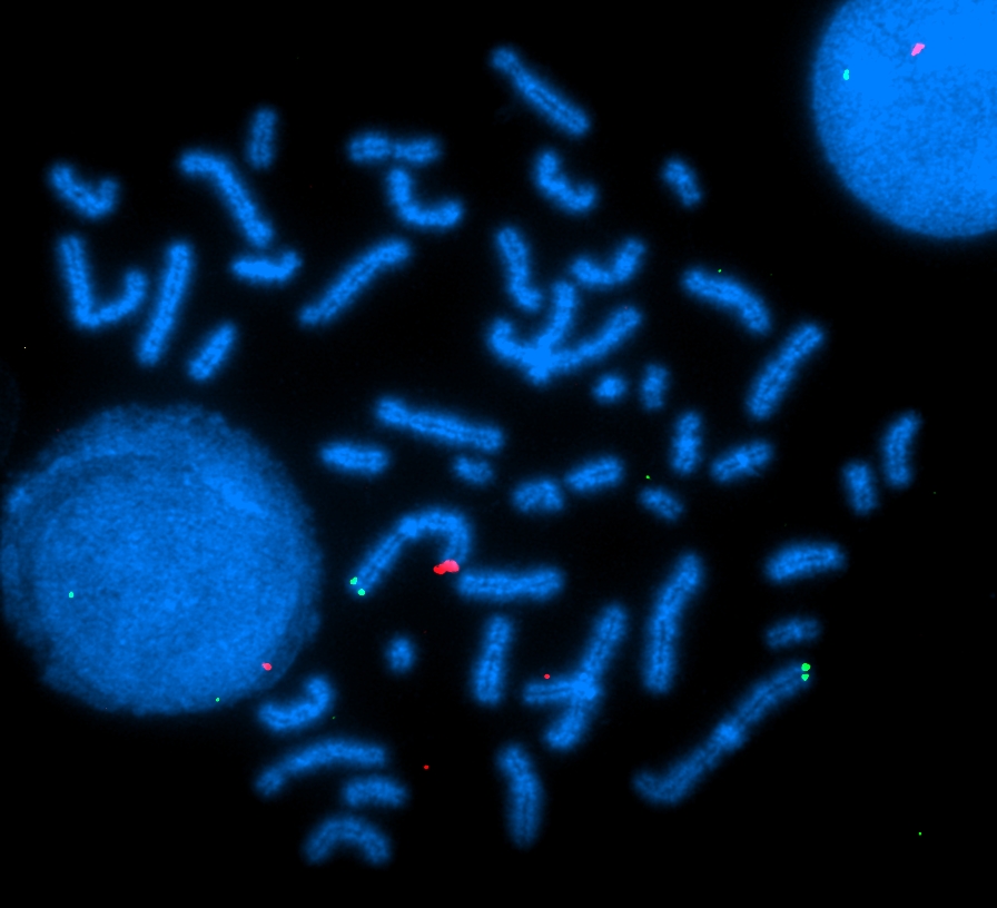 FISH Spectrum Green detects CEB108/T7, DAPI counterstain |